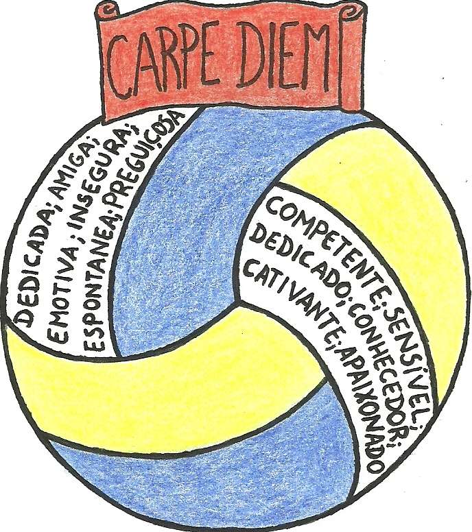 Com este brasão individual, tentei mostrar um pouco de mim. Escolhi a bola de voleibol, porque é a modalidade que pratico desde os 3 anos e da qual sou treinadora desde os 14, sou uma apaixonada deste desporto. Tentei que o formato se assemelhasse ao do simbolo do Futebol Clube do Porto, pois sou uma adepta ferrenha deste clube desde que me lembro. O lema de vida Carpe Diem lembra-me que todos os momentos devem ser aproveitados, o tempo não volta a trás, mas lembra-me também o meu filme de eleição "O clube dos Poetas Mortos", que fala entre outras coisas, da influencia que um professor pode ter na vida dos seus alunos. Quis utilizar a cor laranja no brasão, por fazer referência ao clube de voleibol onde trabalho, o Castêlo da Maia Ginásio Clube, por ser um sitio onde fui muito bem recebida e onde me sinto em casa.